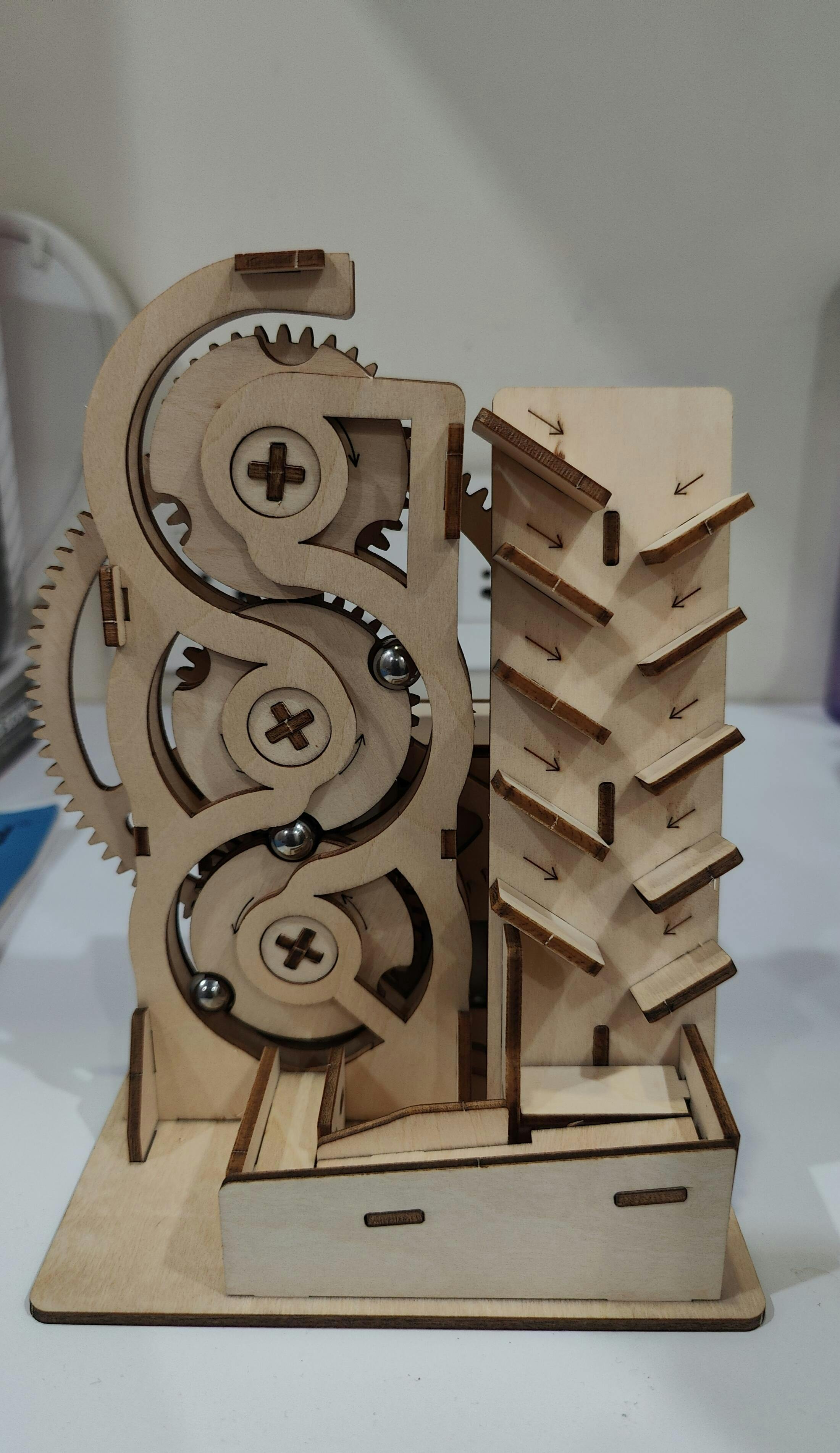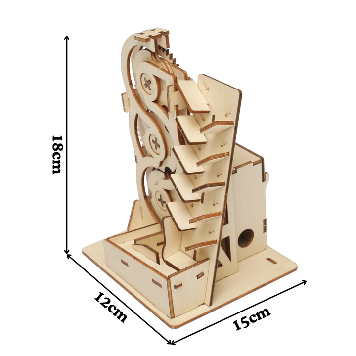 Wooden Puzzle Pieces, Instruction Manual, Motor, Battery Case, Steel Marbles