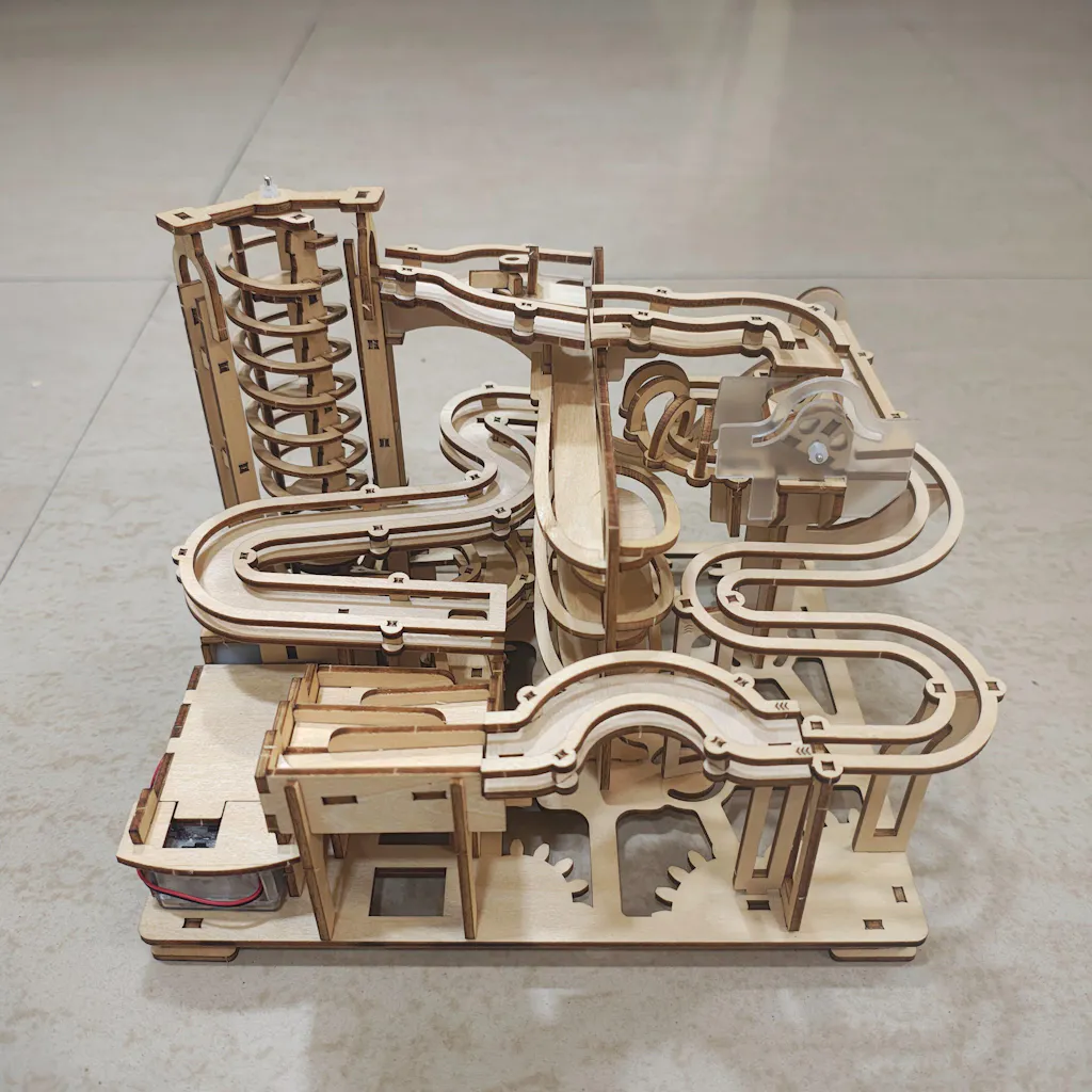 Wooden Puzzle Pieces, Instruction Manual, Motor, Battery Case, Steel Marbles, Steel Rods, Shaft Sleeves
